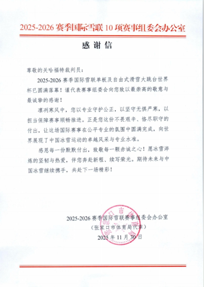 哈尔滨体育学院冬季奥林匹克学院教师关哈福特担任本次赛事竞赛长,全程统筹竞赛组织工作。从赛前赛事规划、裁判队伍组建培训,到赛中赛事流程把控、突发事件应急处置,再到与多部门协同保障,其专业工作助力赛事实现 “零失误、高标准” 办赛目标。赛事组委会办公室还专门发来感谢信,盛赞其以专业守护公正、以坚守保障赛事顺畅,称其付出展现了中国冰雪运动的卓越风采与专业水准,向其致以崇高敬意与诚挚感谢。