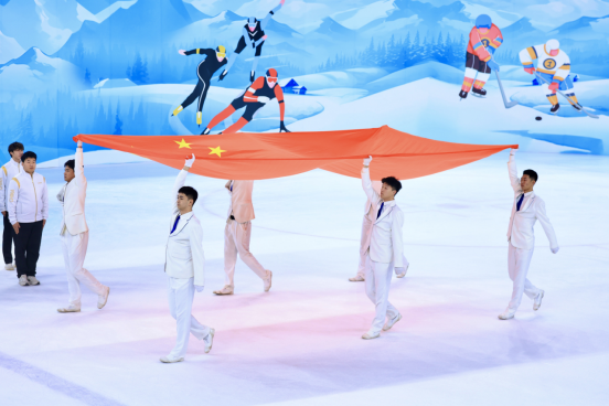 随着我校冬季奥林匹克学院花样滑冰专项学生带来的冰上开场舞《等你来》精彩上演,活动正式启幕。光影流转间,在我校教师罗丹妮的深情讲述与引导下,一堂贯穿“历史—现实—未来”时空维度的沉浸式主题思政课在冰面之上徐徐展开。
