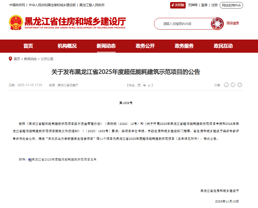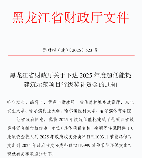 近日,黑龙江省住房和城乡建设厅正式公布2025年度超低能耗建筑示范项目名单,我校申报的“研究生公寓项目”凭借其在建筑节能领域的突出表现,经过建设单位申报、市级推荐、专家评审及社会公示等多环节的严格筛选,成功入选,并获得省级财政奖补资金,首批拨付的44.22万元已到账。