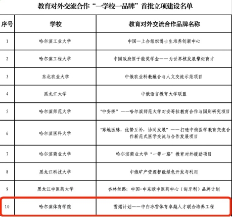 近日,黑龙江省教育厅发布《关于教育对外交流合作“一学校一品牌”首批立项建设的通知》,我校申报的“雪熠计划——中白冰雪体育卓越人才联合培养工程”成功入选全省首批20个品牌项目,彰显了学校在冰雪体育教育国际合作领域的特色优势与扎实成效。