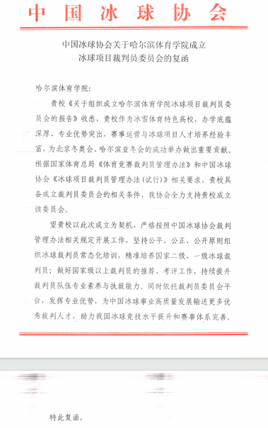 3月31日,中国冰球协会正式复函,同意哈尔滨体育学院成立冰球项目裁判员委员会,成为国内首家获批成立冰球项目裁委会的高校。