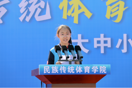 哈尔滨市第四十九中学学生代表杨锦介绍练习武术过程中深刻领悟坚持的意义与永不言弃的精神,使武术成为强健体魄、磨炼意志、塑造勇敢坚毅的品格的有效运动。