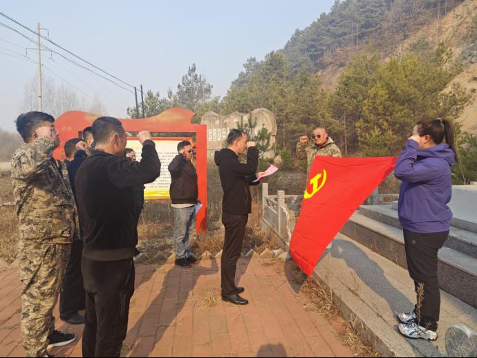 默哀仪式后,驻黑金河村第一书记刘胜昌带领全体党员重温入党誓词。面对鲜红党旗,全体党员高举右拳,庄严宣誓,铿锵有力的誓言响彻遗址上空,不仅是对入党初心的坚定回望,更是传承红色基因、践行初心使命的庄严承诺,彰显着新时代党员干部扎根乡村、实干兴村的坚定决心。