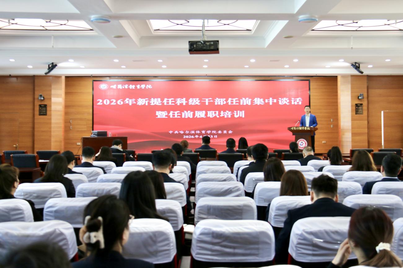 4月23日下午2时,为切实加强我校干部队伍建设,教育引导新提任科级干部牢固树立和践行正确政绩观,促进其迅速完成角色转变、提升履职能力,根据《党政领导干部选拔任用工作条例》相关规定及学校2026年干部教育培训工作实施方案,学校在崇德楼三楼学术报告厅召开2026年新提任科级干部任前集中谈话和任前履职培训会议。学校2026年新提任的40名科级干部参加会议,学校党委副书记王春雷出席会议并对新提任科级干部进行集体谈话,党委组织部部长康凯主持会议。