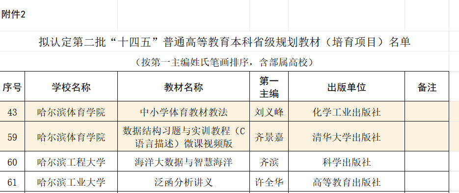 近日,黑龙江省教育厅对拟推荐“十四五”普通高等教育本科国家级规划教材及拟认定第二批省级规划教材(培育项目)的名单予以公示。我校齐景嘉教授的《数据结构(C语言描述)》《数据结构习题与实训教材(C语言描述)微课视频版》和刘义峰教授的《中小学体育教材教法》等3部教材成功入选,其中《数据结构(C语言描述)》被推荐评选国家级规划教材,这标志着我校在教材编写与教学改革领域取得了新的重要突破。