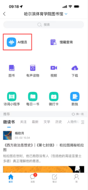 2.使用手机号获取验证码方式进行登陆,首页右上角输入本单位邀请码hrbtyxy进入图书馆页面,点击AI馆员应用。