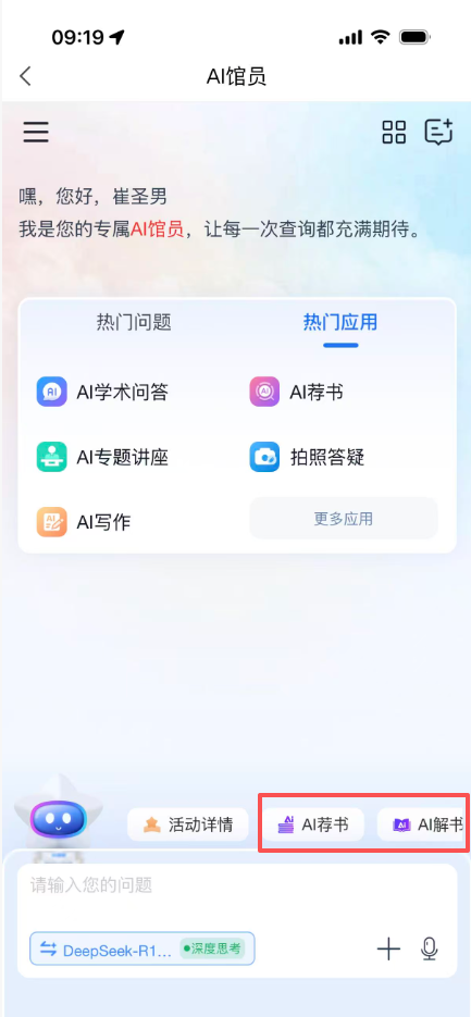 2.纸电资源检索:通过AI馆员询问找到馆藏资源,或者通过AI荐书功能查找电子资源,获得10积分。每日上限30积分。