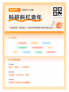 你是深潜于基础理论的“极境深潜员”,还是跨越学科边界的“科研斜杠青年”?维普智图通过AI深度挖掘,经纶·知识服务平台的数据,将那些看似枯燥的搜索记录,转化为你专属的“学术人设”海报。