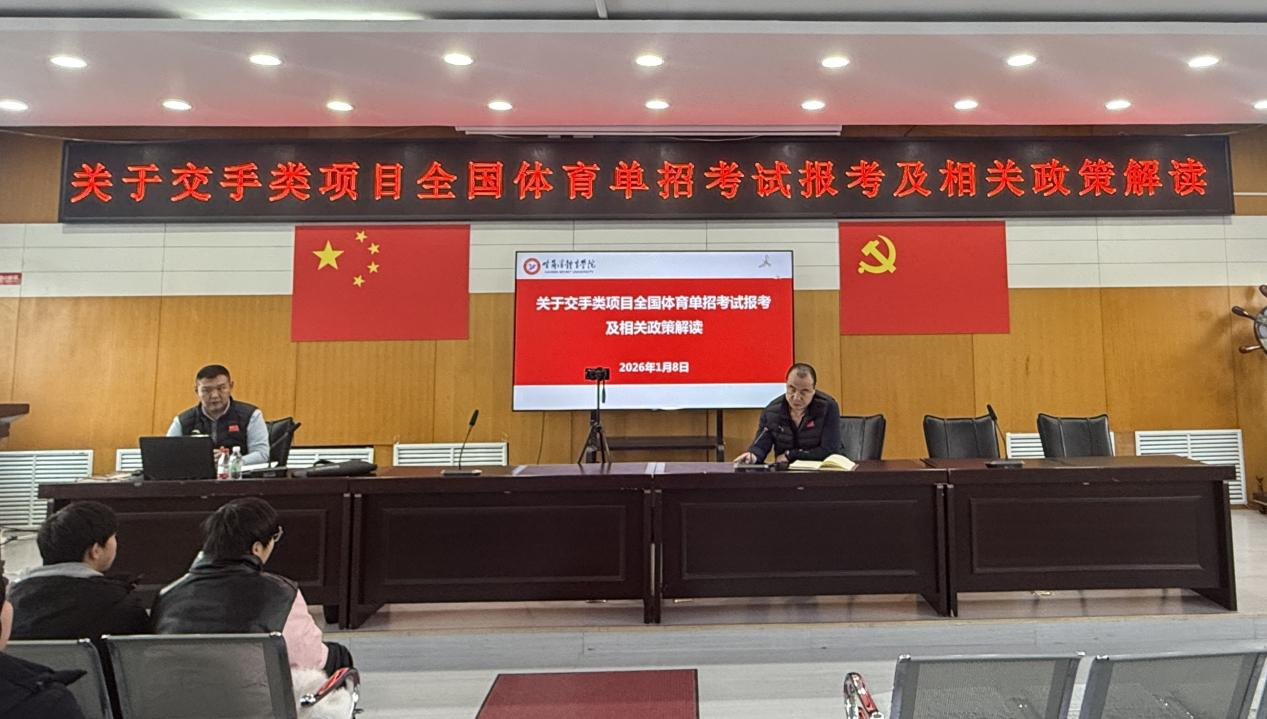 2026年1月8日,哈尔滨体育学院民族传统体育学院与黑龙江省体育局重竞技运动管理中心以业务共建为桥梁,在省体育局重竞技运动管理中心会议室联合举办交手类项目全国体育单招报考及政策专题讲座。本次活动由哈尔滨体育学院民族传统体育学院副院长张忠楼担任主讲,中心拳击、跆拳道、柔道、武术散打项目运动员采用线上线下相结合的方式参与聆听,远在黑龙江省体育局海南临高训练基地的部分运动员也通过云端同步参会,省体育局重竞技运动管理中心训保二科负责人王立平主持活动。