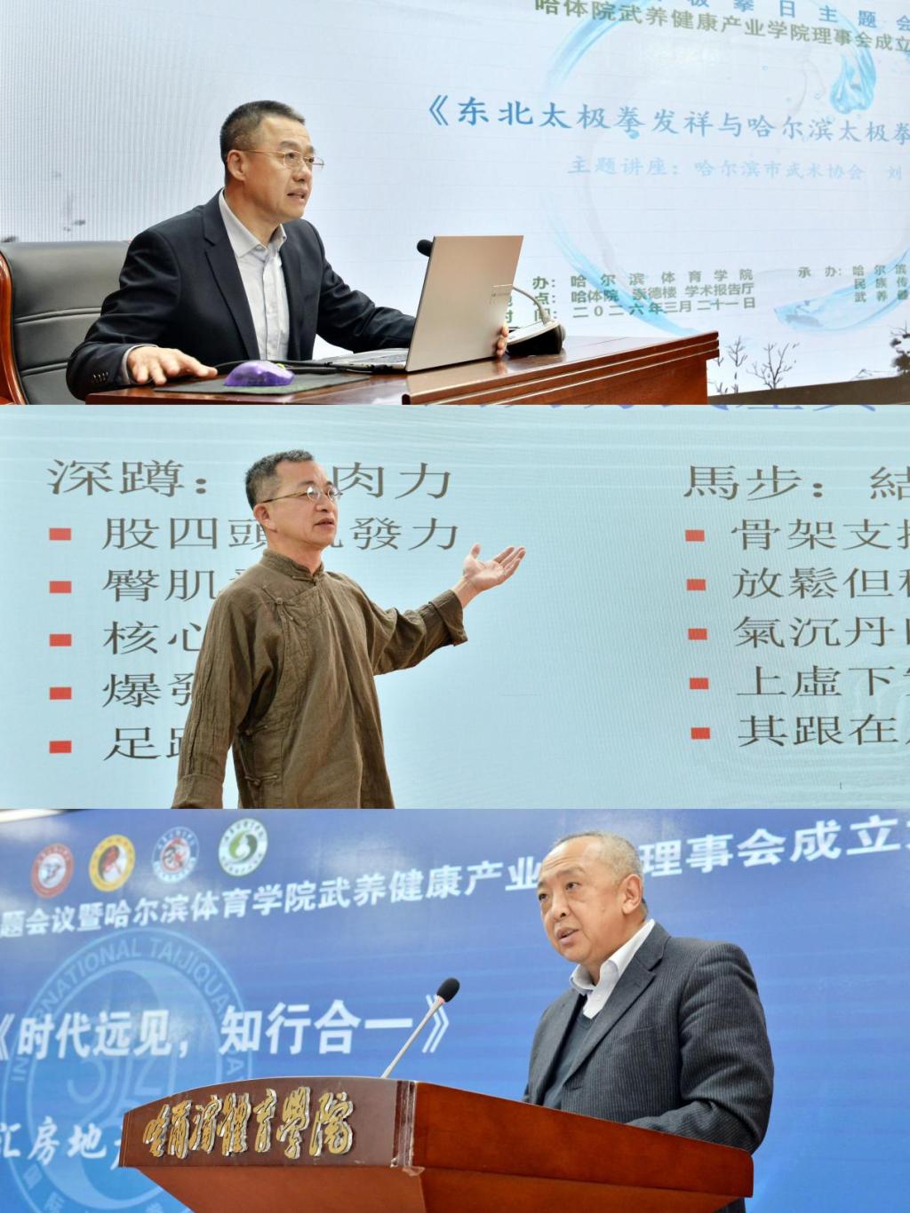 第三阶段的“传太极,筑健康”国际太极拳日主题讲座,在《武韵太极·康养未来》的太极拳表演中拉开帷幕。讲座由民族传统体育学院副院长张忠楼主持。哈尔滨市武术协会会长刘彬作了题为《东北太极拳发祥与哈尔滨太极拳品牌创建》的讲座,深入梳理了东北地区太极拳的历史渊源,分析了哈尔滨打造太极拳文化品牌的优势与路径;台湾中国文化大学教授李志明作了题为《从深蹲到马步:谈武术养生的意义与价值》的讲座,李教授以深蹲与马步的对比为切入点,将传统武术训练与身心学理论深度融合,探讨了武术养生在现代健康管理中的应用价值;黑龙江天汇房地产开发有限公司总经理张劭强作了题为《时代远见,知行合一》的讲座,他立足健康中国战略,分享了武术康养产业发展的前沿思考,提出了产学研融合的创新途径。三位专家的讲座内容丰富、视角多元,为武术与康养产业的深度融合提供了理论支撑和实践指导。