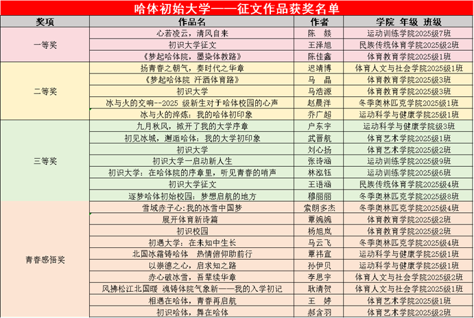 为增加新生对哈体的了解,提升对学校的认同感和归属感,校团委在2025级学生中开展“初识大学”主题征集活动,本次活动共征集到作品500余份。通过各级团组织广泛动员、精心指导,择优推报,经联评,评选出以下优秀作品:
