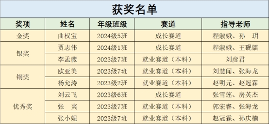 沉着应战,再创佳绩。在激烈的校级决赛中,我院选手凭借清晰明确的职业目标、科学合理的成长路径规划以及从容自信的现场表现,斩获多项殊荣:成长赛道收获金奖1项、银奖1项、优秀奖1项;本科组就业赛道收获银奖1项、铜奖 2 项、优秀奖2项。孙玥、程淑娥、刘彦君三位老师因指导成效显著,荣获“优秀指导教师”称号;体育教育学院凭借出色的组织协调工作,获评“优秀组织奖”。