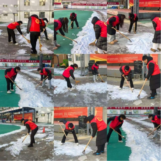 本次活动由体育教育学院学生会执行主席张步凡带队,与14名体育教育学院志愿者前往抚顺社区,开展环境整治工作。到达现场后,结合社区实际需求,明确破冰铲雪、垃圾清理、路面巡检等任务分工。志愿者们身着统一志愿服装,手持铁锹、扫帚等工具,以饱满的精神状态投入到环境整治工作中。尽管当日寒风凛冽,志愿者们的热情却丝毫未减。大家分工协作、默契配合:有的弯腰挥铲破除路面坚冰,有的手持扫帚清扫残余积雪,有的合力清理弯道、陡坡等易滑路段,志愿者们忙碌的“志愿红”身影,在皑皑白雪的映衬下,构成了冬日里最温暖的风景线。同时,志愿者们还化身“安全宣传员”,温馨提醒过往居民注意出行安全,将关怀与服务送到群众身边。