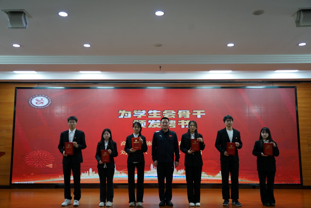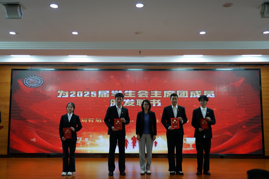 大会同期举行“优秀学生骨干表彰与2025届学生会主席团聘任仪式”,以榜样力量激发全体学子的奋进动能。副院长姚小林、党总支副书记杨涛、院长王飞依次为前期工作中表现突出的学生代表颁奖授聘,寄托学院对学生组织发挥桥梁纽带作用、引领同学共同进步的殷切期望。