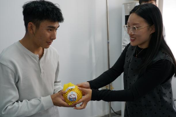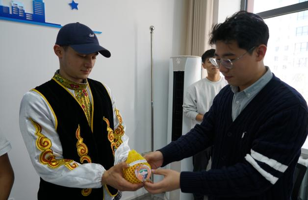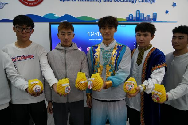 在周雨欣的主持下,辅导员们与学生代表共同启动"石榴传情"仪式。红彤彤的石榴在师生手中传递,每颗石榴上都贴有"石榴籽"标识。辅导员刘帅深情寄语:"这颗红形彤的石榴,象征着我们 56 个民族紧紧相拥。"少数民族学生代表双手接过石榴,脸上洋溢着感动的笑容。