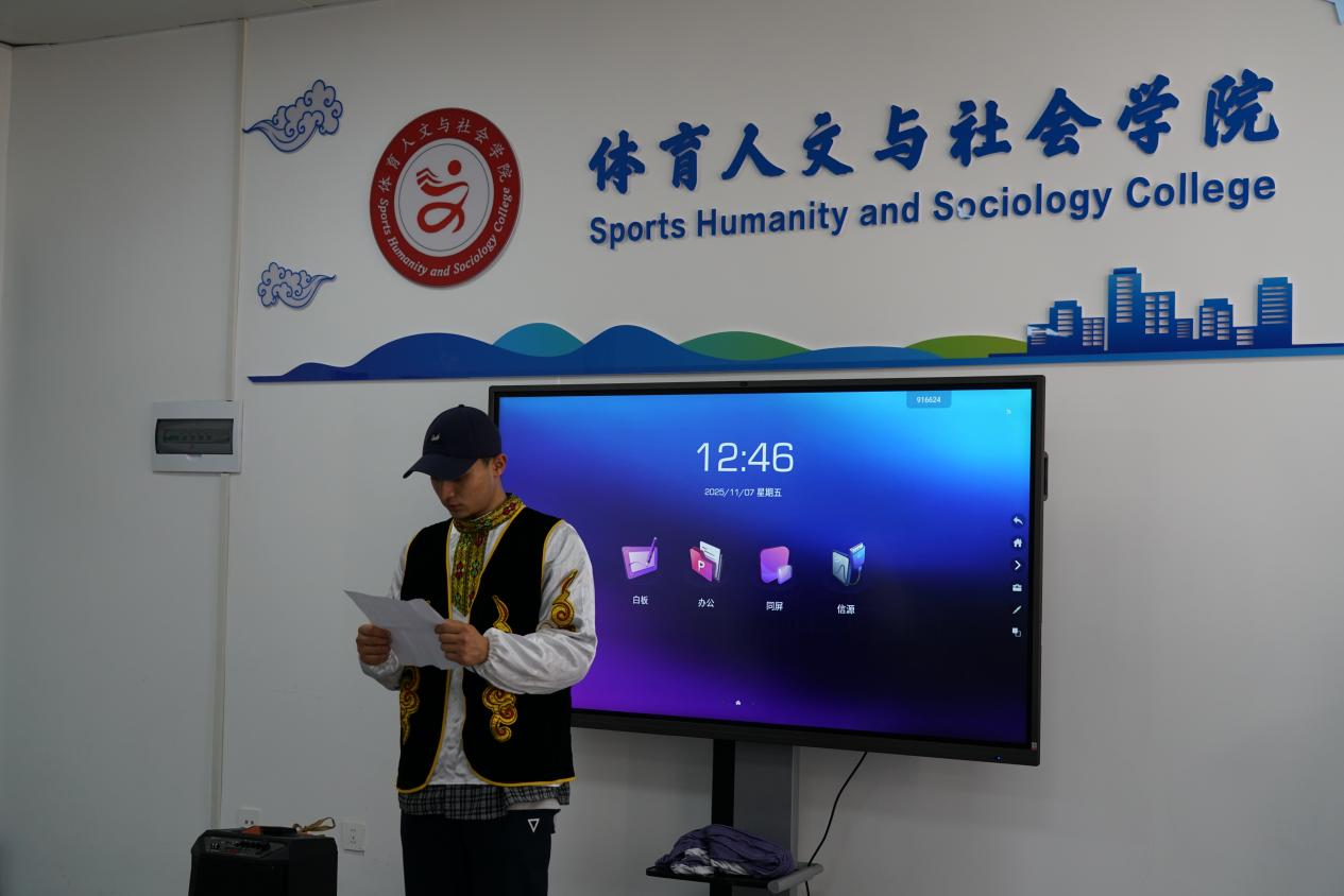为铸牢学院广大团员与少数民族同学中华民族共同体意识,促进校园多元文化交流,形成人心凝聚、团结奋进的强大精神纽带,体育人文与社会学院于11月7日12:00在一教四楼会议室举办“石榴结籽心连心,民族团结一家亲”主题团日活动,深入学习贯彻习近平总书记日前在新疆维吾尔自治区成立 70 周年之际听取新疆维吾尔自治区党委和政府工作汇报时的重要讲话精神,助力大一少数民族同学尽快适应大学生活,推动民族团结工作走深走实。此次活动由周雨欣主持,辅导员董宜鹏、刘帅出席,全体学生团员及大一省外6名少数民族学生代表共同参加。