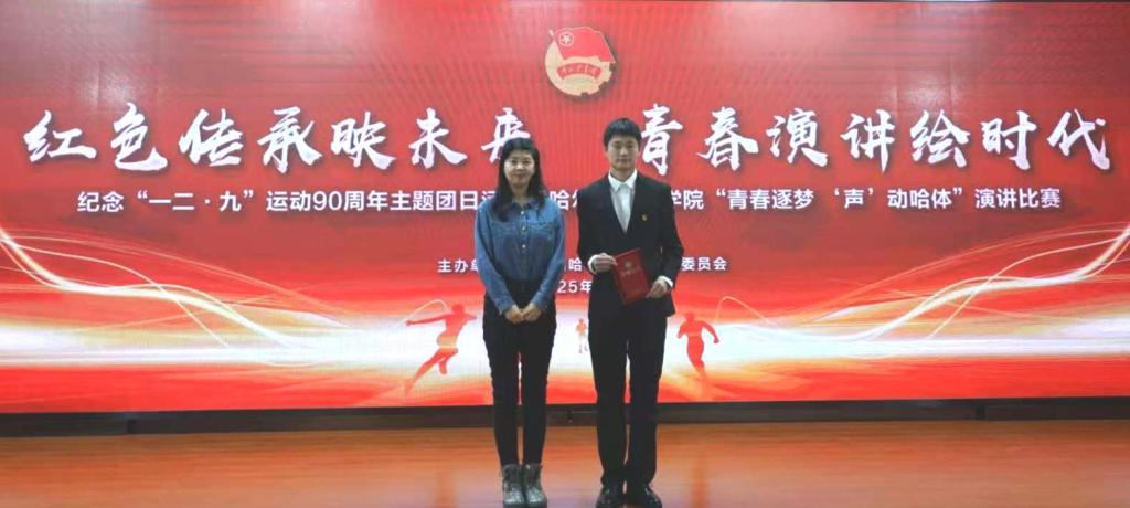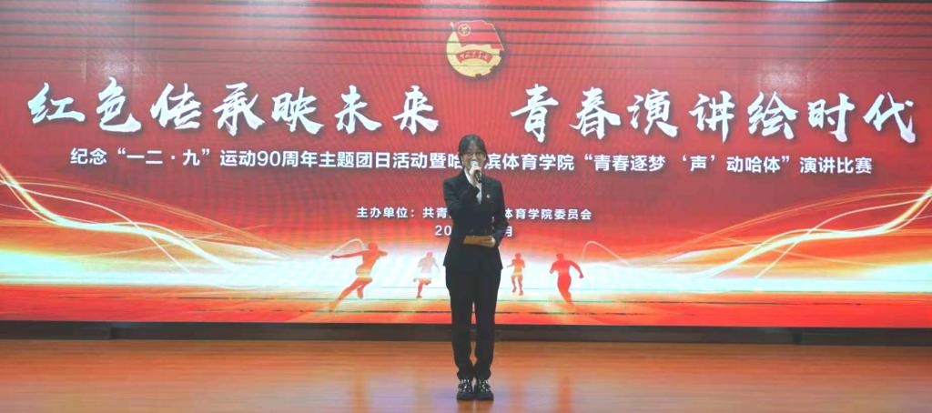 25级3班王欣怡同学以“青春逐梦 ‘声动哈体”为核心,展现出体育院校青年学子的青春朝气与出众潜力。她在现场深情阐释:“历史并非尘封的档案。新时代的一二九精神,对我们而言,就是将个人理想融入国家发展:是刻苦训练,为国争光。” 这番表达既贴合体育院校学子的身份,又诠释了新时代青年对“一二·九”精神的传承与践行,赢得现场评委与观众的一致认可。