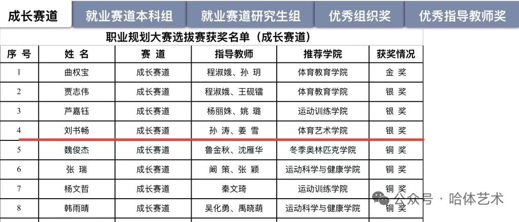 成长赛道上,刘书畅同学以稳健的表现、清晰的成长脉络呈现,展现了体育艺术专业学生的成长潜力与进取姿态,最终荣获第四名,摘得银奖!
