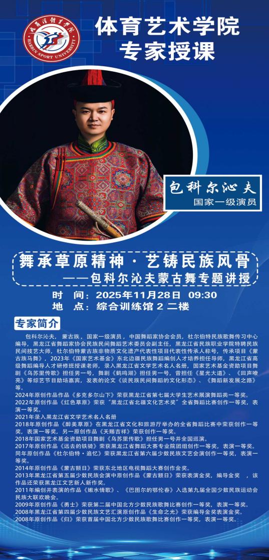 2025年11月28日到30日,哈尔滨体育学院体育艺术学院特邀国家一级演员、蒙古族马舞非遗传承人包科尔沁夫老师,在综合训练馆2二楼开展为期三天的非遗蒙古族马舞专题课程。从把上基础姿态到把下组合,包老师以手把手的示范、文化与动作交织的讲解,让草原马舞的风骨,落进了每一个课堂细节。包科尔沁夫,蒙古族,国家一级演员,蒙古族马舞非遗传承人。现任杜尔伯特民族歌舞传习中心编导,兼任多所院校民族舞蹈导师,是《国家艺术基金》舞蹈编创项目导师,主演《乌苏里传歌》《鹤鸣湖》等舞剧,原创作品多次获黑龙江省舞蹈赛事创作、表演一等奖,深耕民族舞蹈传承与创作。