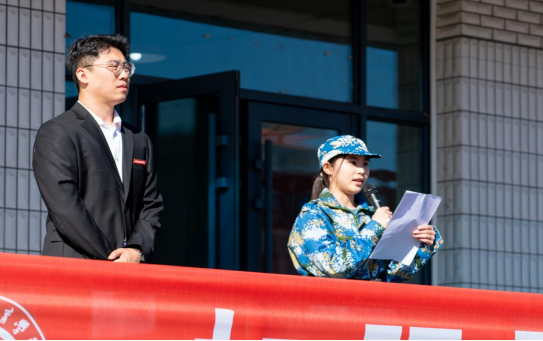 升旗礼毕,民族传统体育学院2025级新生代表张宇同学发言。她呼吁全体同学铭记历史、珍爱和平,坚定理想信念,锤炼专业技能,以实际行动践行“请党放心,强国有我”的青春誓言,为实现中华民族伟大复兴贡献哈体学子的力量。