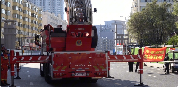 警灯闪烁,警笛长鸣。南岗区消防救援中队车辆抵达现场,消防员首先利用水炮消防车扑灭火焰,随后升起云梯车,使用现代化设备为被困学生搭建救援通道,最终成功完成救援。