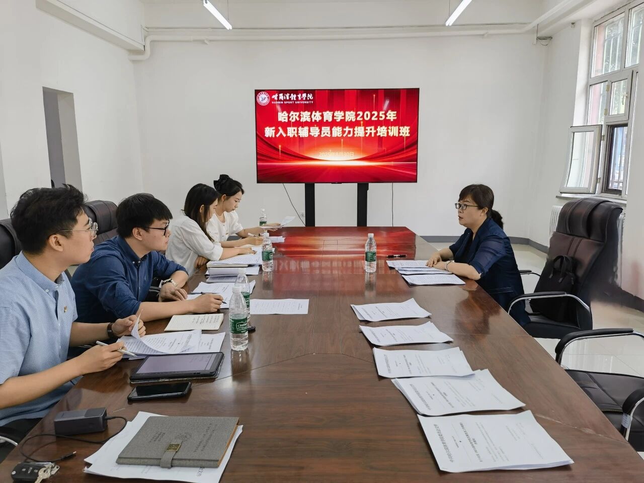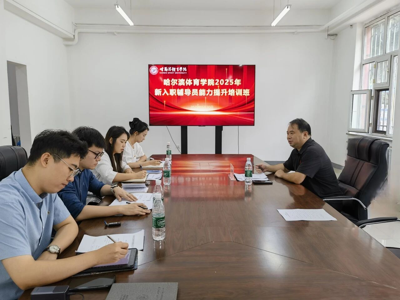 为贯彻落实习近平新时代中国特色社会主义思想,进一步落实2025年全国教育工作会议精神,推进时代新人铸魂工程,加强我校辅导员队伍专业化、职业化建设,进一步推动我校学生工作高质量发展,8月30日,学生工作部(处)在第六公寓会议室举办哈尔滨体育学院2025年新入职辅导员能力提升培训班。校党委副书记王春雷出席培训班并讲话。学生工作部(处)部长张海滨、团委书记赵荣荣、党委组织部副部长徐烨、就业指导与职业生涯规划教研室教师沈雁华教授、学生工作部(处)副部长崔晓佳、学生工作部(处)副处级辅导员于科宇、学生工作部(处)公寓管理中心副主任王敬国为培训班学员进行授课。培训结束后,四名新入职的辅导员结合所学内容进行了讨论发言。
