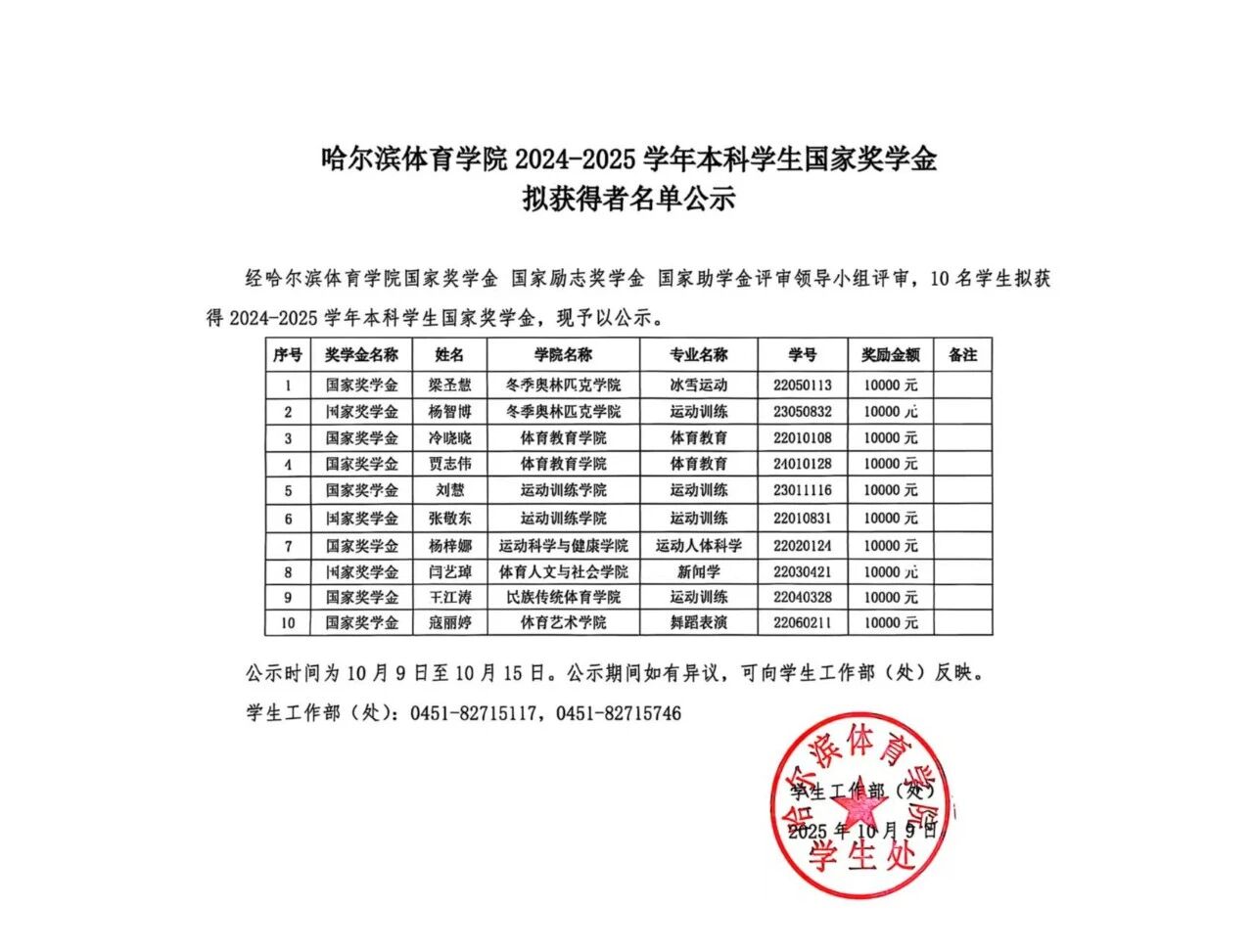 哈尔滨体育学院2024—2025学年本科学生国家奖学金拟获得者名单公示
