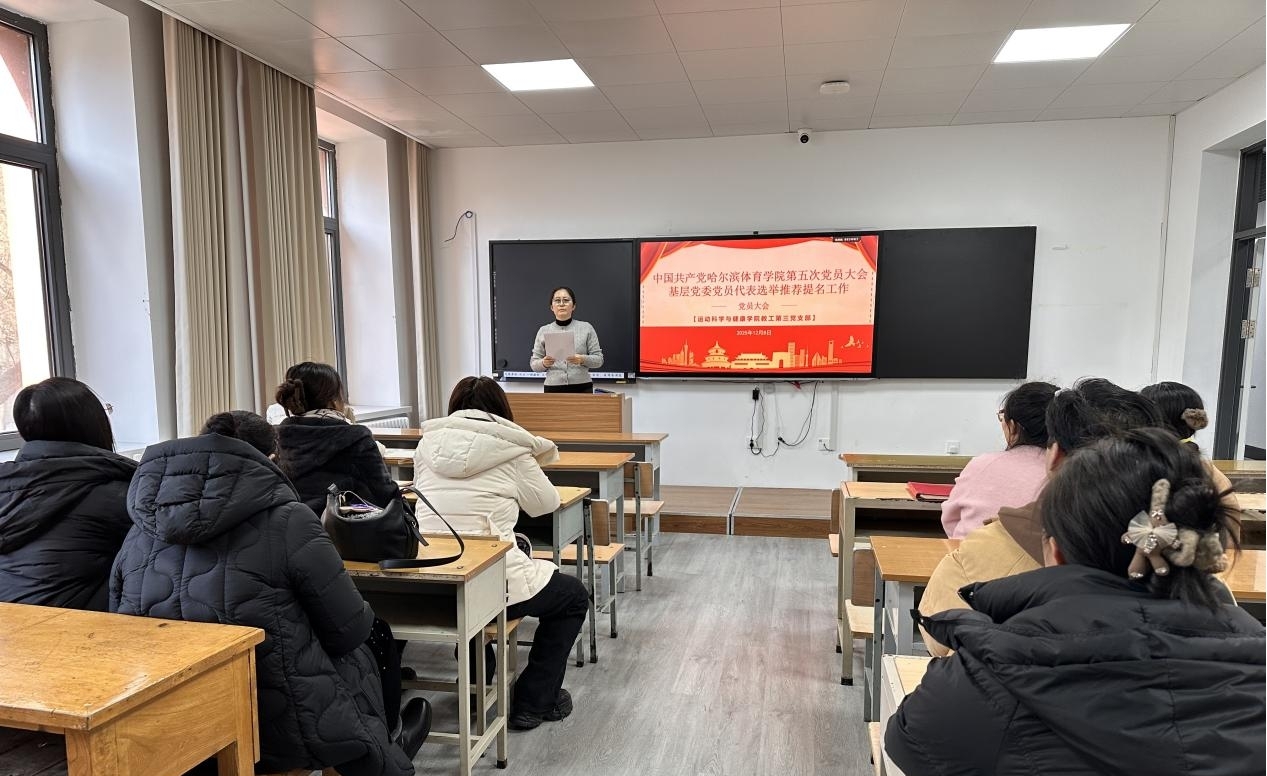 哈尔滨体育学院运动科学与健康学院教工第三支部党员大会于2025年12月8日在1204教室召开,由井宏颖同志主持。会议根据相关规定和工作部署,主要任务是选举通过本支部出席中共哈尔滨体育学院第五次党员代表大会的代表候选人名单。经学院党委同意,本次大会确定王楷、井宏颖、吴楠、吴化勇、彭丽娜(按姓氏笔画为序)5名同志为代表候选人建议名单,并提请大会通过。