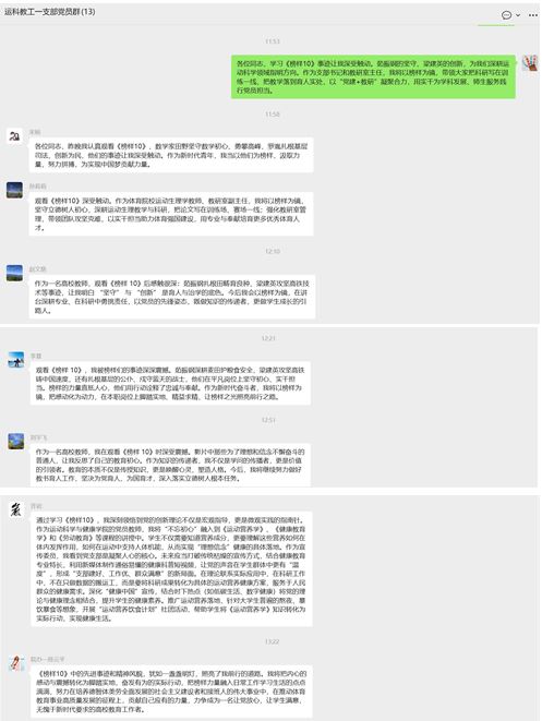 全员完成自学后,支部依托微信群开展线上集中研讨,由支部书记主持,党员们围绕茹振钢、梁建英等先进个人及义乌市天盟实业投资有限公司党支部等先进基层党组织事迹,结合运动科学学科特色与本职工作热烈交流。“茹振钢的坚守、梁建英的创新,为我们深耕运动科学领域指明方向”,支部书记的发言引发共鸣;青年教师宋杨表示要以田野、罗胤为榜样,在青春赛道上拼搏奋进;教研室副主任孙莉莉提出要 “把论文写在训练场、赛场一线”,以实干助力体育强国建设;宣传委员许岩则结合专业特长,规划通过新媒体健康科普短视频传递党的声音,让理论宣传更有温度。大家各抒己见、相互启发,将榜样精神与育人治学、支部建设深度融合,凝聚起 “学习榜样、争当榜样” 的共识。