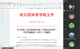 会议首先开展了人才政策专题学习。教研室教师学习了《新时代龙江人才振兴 60 条》《哈尔滨体育学院“哈体青年学者”培育实施办法(试行)》等文件,对人才类别、申报条件、支持措施及考核要求等重点内容进行了解读。与会教师结合自身实际,围绕职业发展规划、科研方向凝练等进行了交流讨论。大家表示,通过学习进一步了解了学校人才政策体系,明确了努力方向。