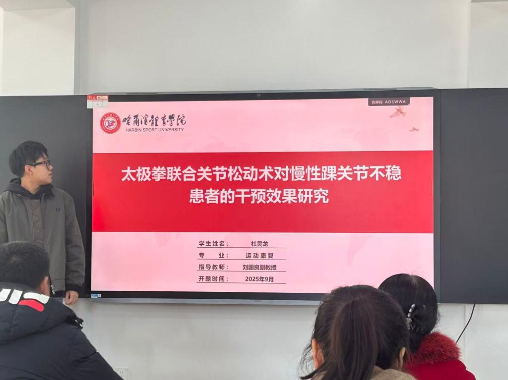 杜昊龙同学开题《太极拳联合关节松动术对慢性踝关节不稳患者的干预效果研究》,系统梳理致病原因及研究现状,旨在验证联合干预的有效性,比较其对踝关节功能、动态平衡等指标的影响。