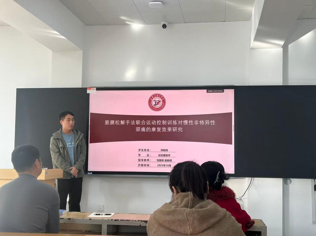 师晓伟同学开题研究《筋膜松解手法联合运动控制训练对慢性非特异性颈痛的康复效果》,通过主客观指标评估联合干预对症状及功能障碍的改善作用,并与单一干预方式对比。