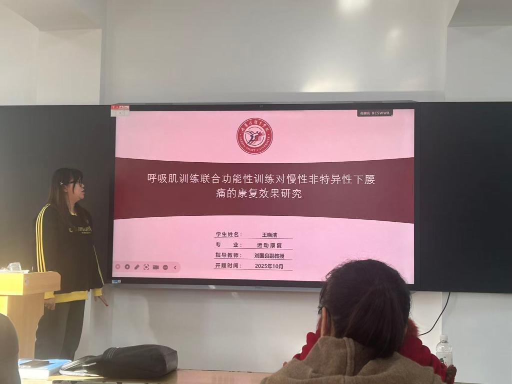 王晓洁同学开题《呼吸肌训练联合功能性训练对慢性非特异性下腰痛的康复效果研究》,分析致病机制及干预现状,期望联合训练缓解疼痛、增强功能,为治疗提供新思路。