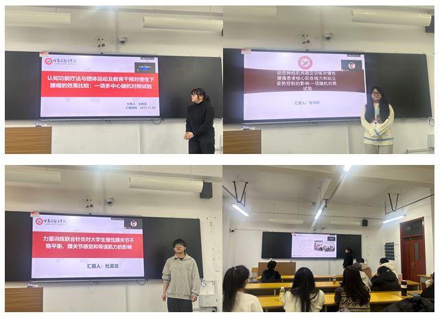 王晓洁同学分享了《认知功能疗法与团体运动及教育干预对慢性下腰痛的效果比较:一项多中心随机对照试验》,该研究比较了认知功能疗法与团体运动及教育干预在慢性下腰痛患者中的疗效差异。张可昕同学分享了《动态神经肌肉稳定训练对慢性腰痛患者核心肌收缩力和站立姿势控制的影响:一项随机对照试验》,探讨了该训练方法对慢性腰痛患者核心肌力与姿势控制能力的作用。李煜龙同学分享了《血流限制训练对慢性非特异性下腰痛男大学生运动员核心肌力及疼痛的影响》,研究了血流限制训练在缓解疼痛与提升核心肌力方面的效果。杜昊龙同学分享了《力量训练联合针灸对大学生慢性踝关节不稳平衡、踝关节感觉和等速肌力的影响》,分析了联合干预对踝关节不稳大学生平衡能力、关节感觉及肌力的改善作用。