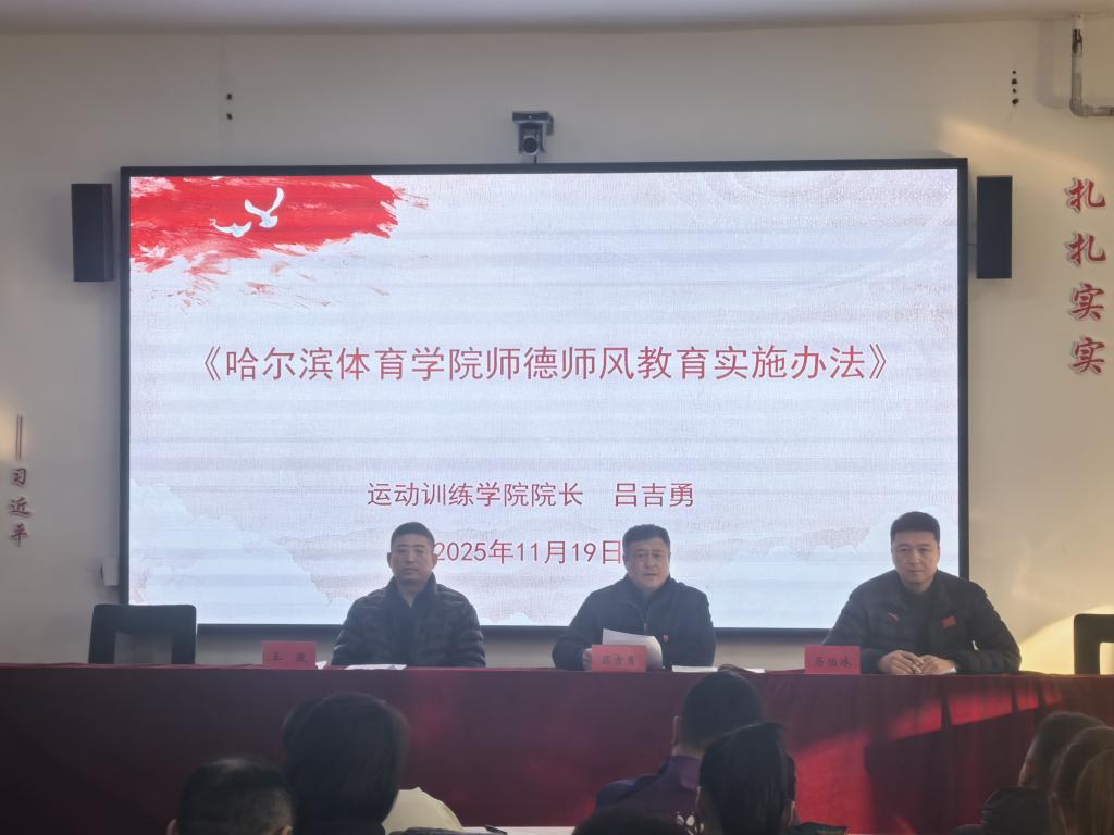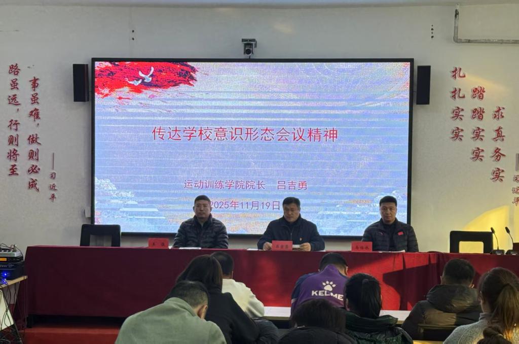 为深入落实立德树人根本任务,筑牢教师队伍思想根基与育人底线,哈尔滨体育学院运动训练学院于 2025年11月19日召开师德师风建设和意识形态工作专题会议,学院领导班子及全体教职工参会。